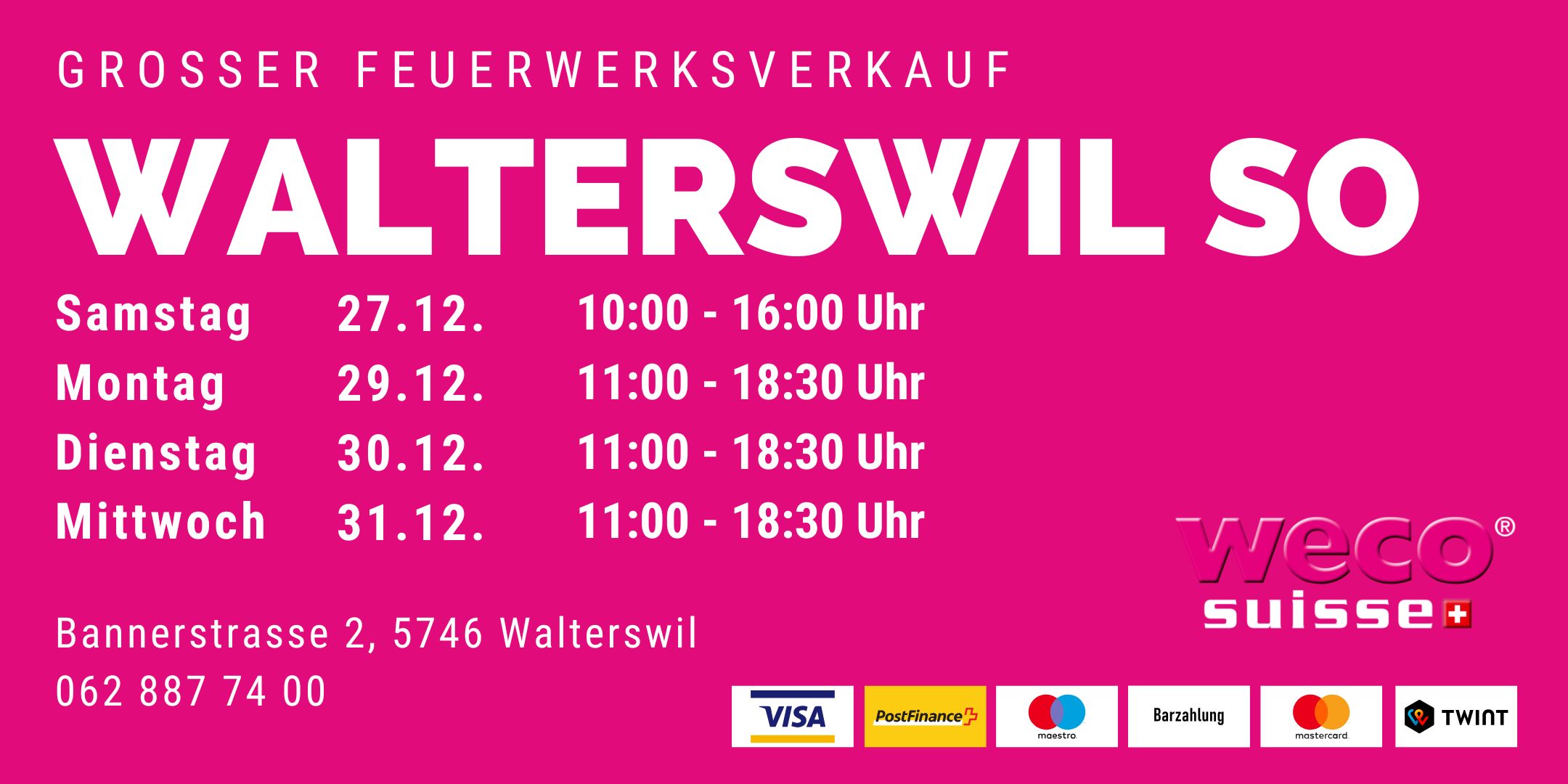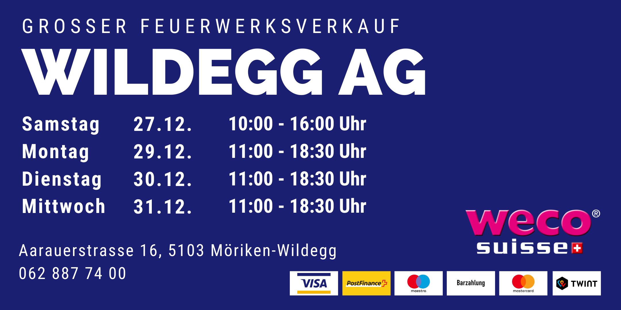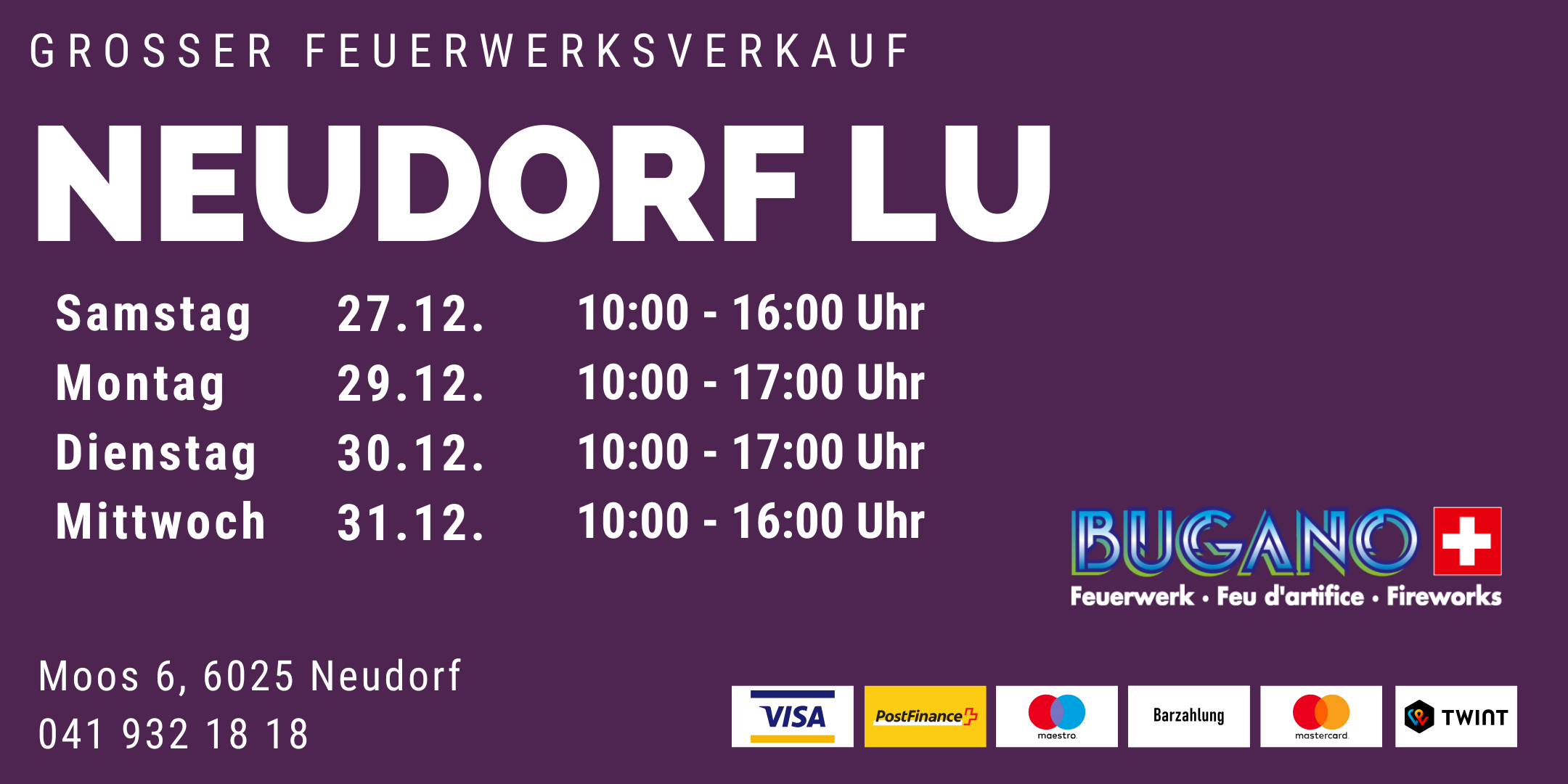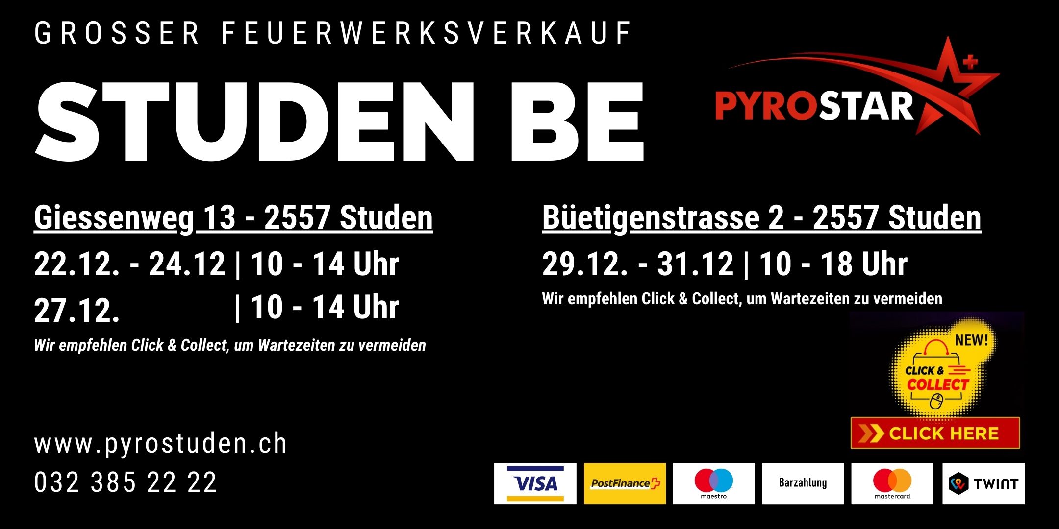 Am 1. August und an Silvester lassen wir es krachen, grosser Verkauf von Feuerwerk an unseren Standorten Studen BE, Neudorf LU, Walterswil SO und Wildegg AG. Bei uns finden Sie ein grosses Feuerwerksortiment für Gross und Klein. Bitte beachten Sie, dass wir an unseren Verkaufsständen nicht das ganze Pyrostar Sortiment anbieten. Wir freuen uns auf Ihren Besuch.